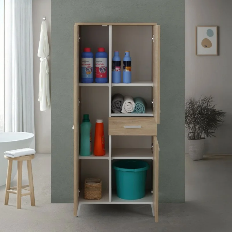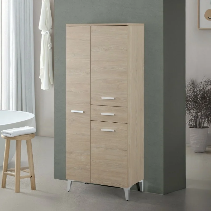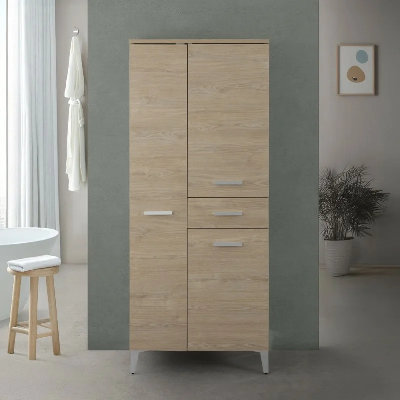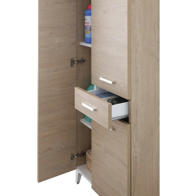 Realizzato in legno nobilitato da 18 mm, antigraffio e resistente ,la colonna bagno multiuso dispone di cassetto scorrevole e due ante con ripiani interni e apertura mediante maniglie cromate.