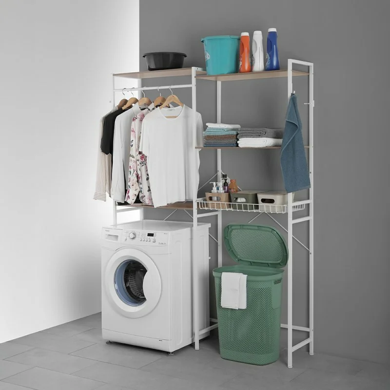 Scaffale per lavatrice con 4 ripiani, cestello scorrevole e barra appendiabiti