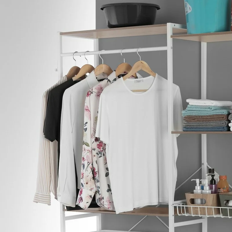Con questo scaffale multiuso potrai organizzare al meglio la tua zona lavanderia in pochi e semplici passi. Posizionabile direttamente sopra l’elettrodomestico, dispone di 4 ripiani in legno MDF, cestello scorrevole e barra appendiabiti per l’apposizione e l’organizzazione dei propri oggetti personali. E’ solido e duraturo in acciaio resistente, con appositi piedini in gomma da appoggio e ganci per fissaggio. Facile e veloce da montare, basta poco per metterlo in utilizzo.
