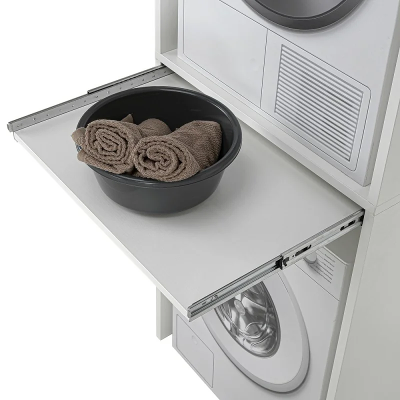 Rinnova e organizza la tua zona lavanderia con il Set Colonna Lavanderia della linea Pilar, la soluzione perfetta per unire funzionalità e stile. Questo set, in robusto legno di bianco, è progettato per ottimizzare lo spazio e dare un aspetto pulito e ordinato al tuo ambiente. Include un coprilavatrice e un copri asciugatrice che si sovrappongono, proteggendo i tuoi elettrodomestici da polvere e umidità. Il punto di forza di questo mobile è il pratico piano d'appoggio scorrevole, un ripiano a scomparsa che ti offre una superficie extra per piegare i panni o appoggiare i detersivi.