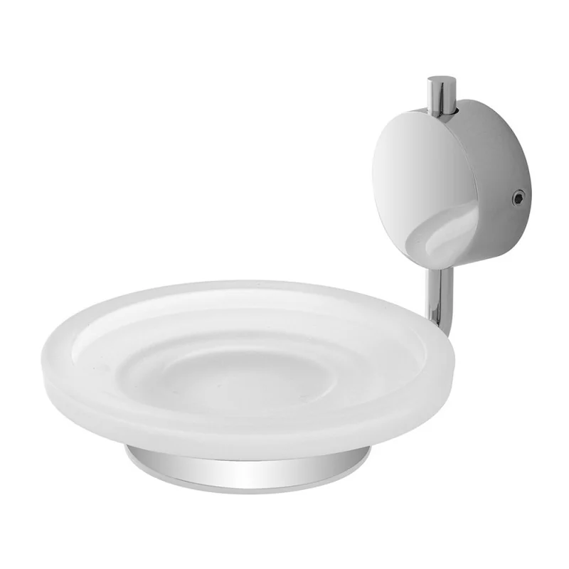 Porta sapone da parete in acciaio dalla finitura cromo lucida e vetro satinato linea Plaza con doppia modalità di fissaggio