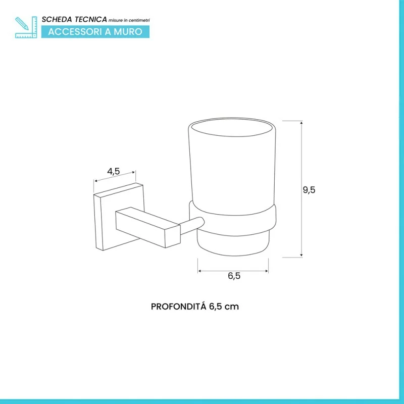 Il portaspazzolino è composto dal bicchiere in vetro satinato e dal supporto in metallo cromato,dotato di una semplice applicazione a muro compresa di viti. Completano l’acquisto accessori complementari della stessa linea: appendino, appendino ,portasciugamani, dispenser portasapone.