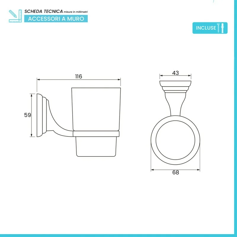 Il portaspazzolino è composto dal bicchiere in vetro satinato e dal supporto a muro in acciaio cromato compreso di viti. Completano l’acquisto diversi accessori della stessa linea:portasciugamani,portasapone,portarotolo,appendini.