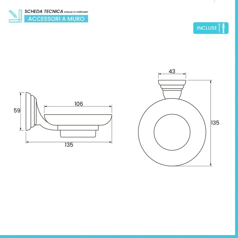 Il porta sapone è composto dal piattino in vetro satinato e dal supporto a muro in acciaio cromato compreso di viti. Completano l’acquisto diversi accessori della stessa linea:portasciugamani,portaspazzolino,portarotolo,appendini.