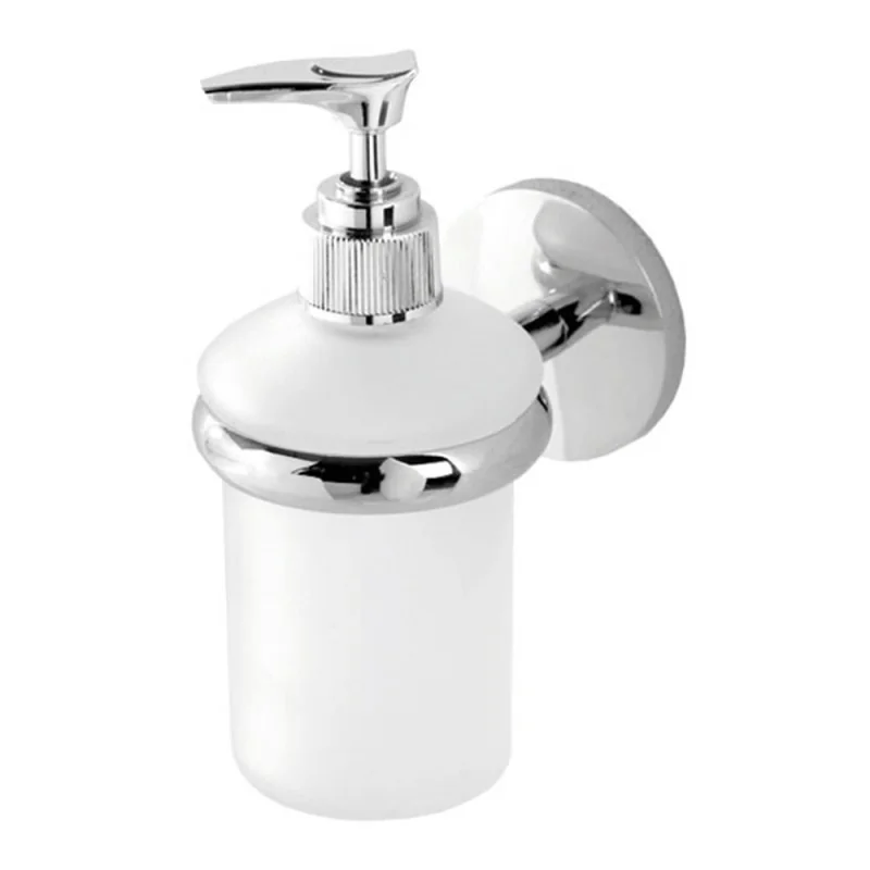 Il dispenser sapone a muro è composto dal dosatore in vetro satinato e dal supporto in acciaio cromato con un comodo fissaggio alla parete incluso di viti. Fanno parte della stessa linea diversi accessori complementari:portarotolo,portaspazzolino,appendino,mensola.