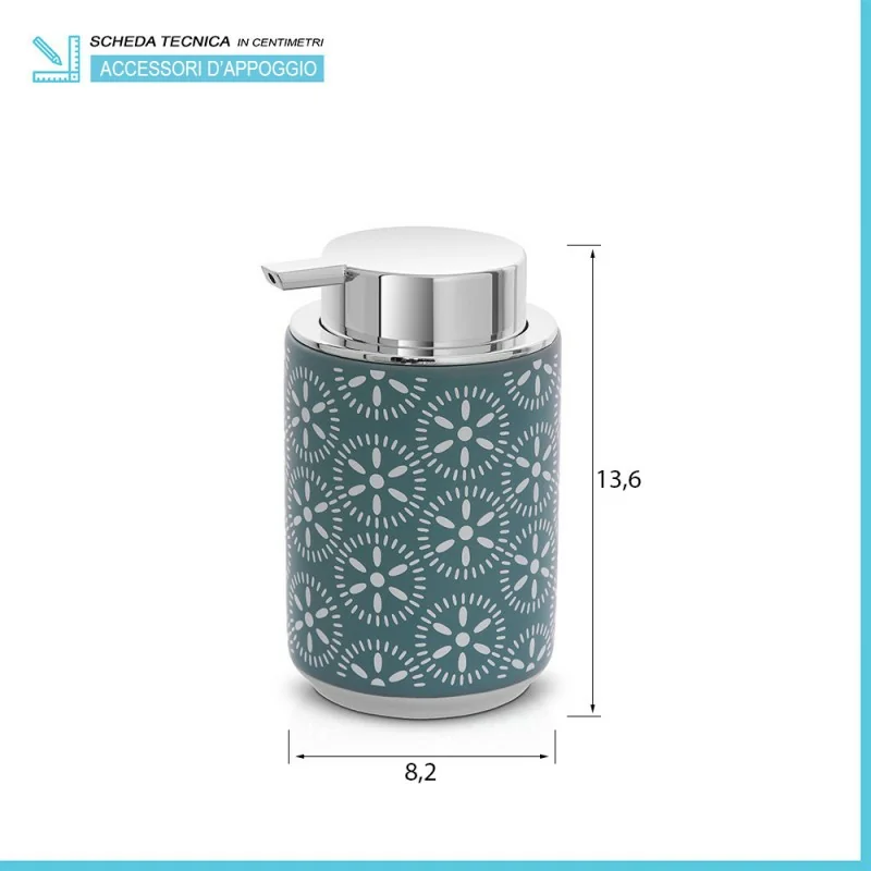 Ciascun prodotto è realizzato in ceramica di alta qualità,in grado di garantire al prodotto resistenza nel tempo. Il dispenser proposto è turchese cobalto,con pompetta erogatrice cromata.