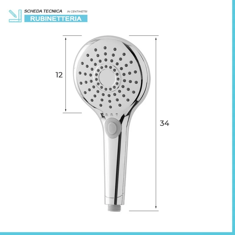 Questa doccetta è realizzata in ABS,materiale resistente,anticalcare con finitura cromata. Ha un'impugnatura comoda. Il soffione tondo ha un diametro di 12 cm e tre modalità di getto.