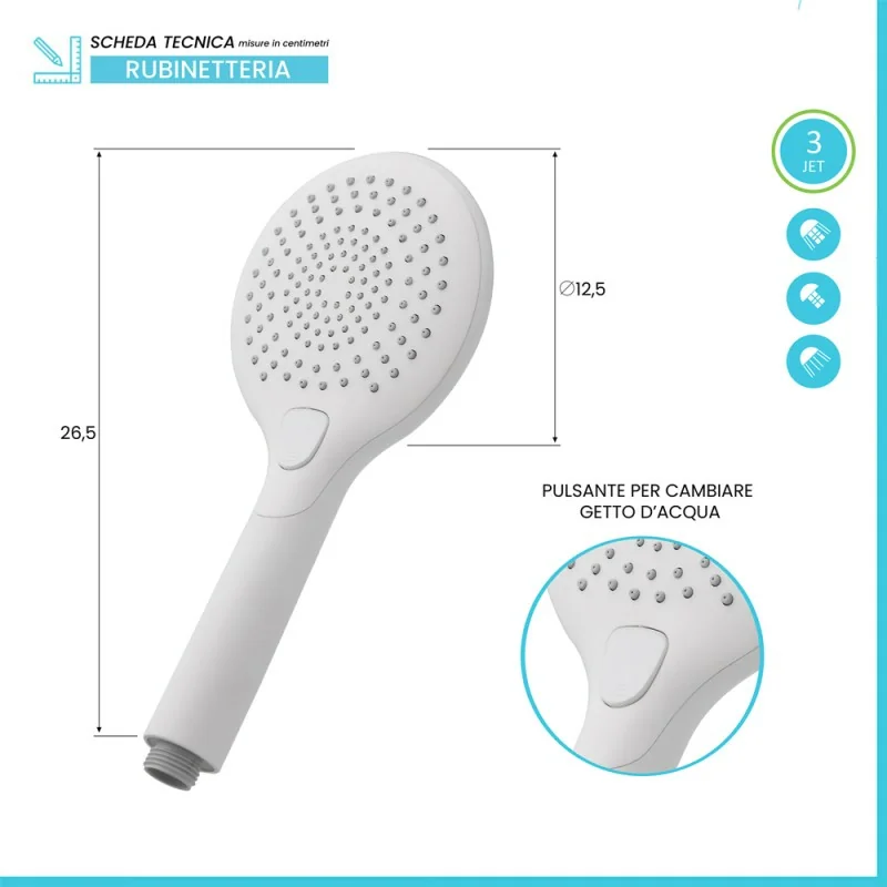 Doccetta con 3 modalità di getto bianca anticalcare con pulsante per cambiare getto
