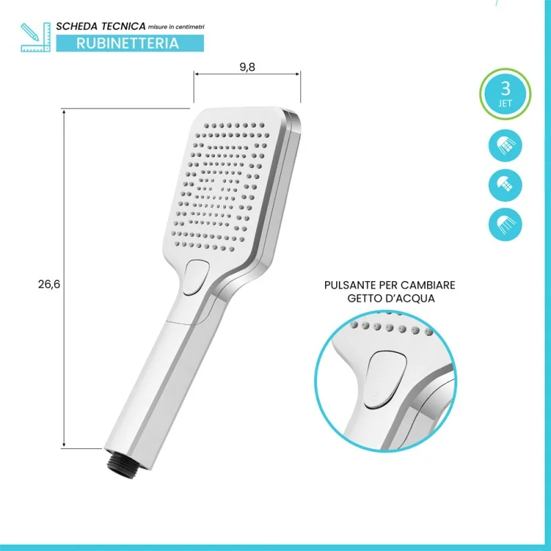 Doccino per doccia quadrato da 26,6 cm tre getti con pulsante per cambio in ABS con finitura cromata Hidra   Un'esperienza di benessere...