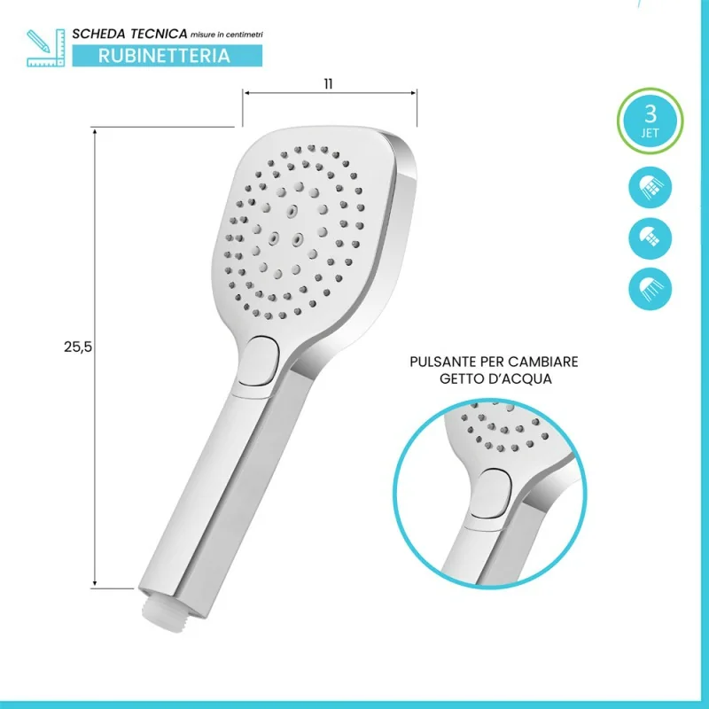 Il doccino dal design quadrato con angoli smussati, con la sua linea moderna e la lucentezza cromata, dispone di un pulsante per il cambio getto offrendo 3 modalità di erogazione dell’acqua differenti. Gli ugelli sono disposti in modo circolare permettendo un getto centrale più intenso e getti esterni più delicati o focalizzati.  Realizzato in ABS resistente e leggero, promette un rituale di rigenerazione su misura, unendo praticità grazie all’attacco standard e un tocco di design contemporaneo.