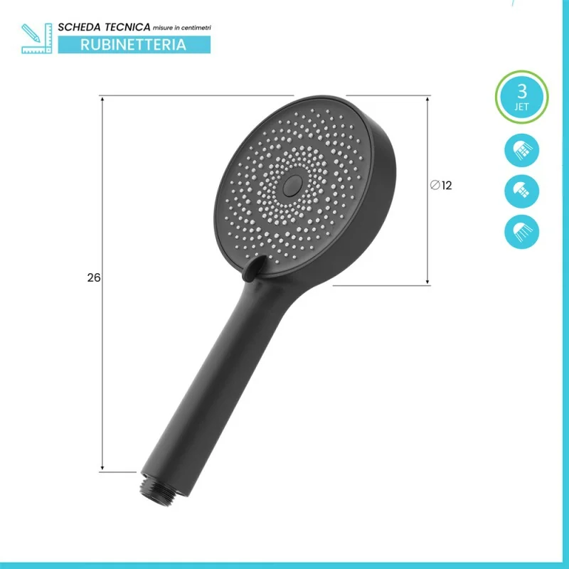 Doccetta tonda moderna 26cm nero opaco a tre getti in ABS anticalcare Hidra ugelli Doccetta tonda moderna 26cm nero opaco a tre getti in ABS anticalcare Hidra scheda Doccetta tonda moderna 26cm nero opaco a tre getti in ABS anticalcare Hidra