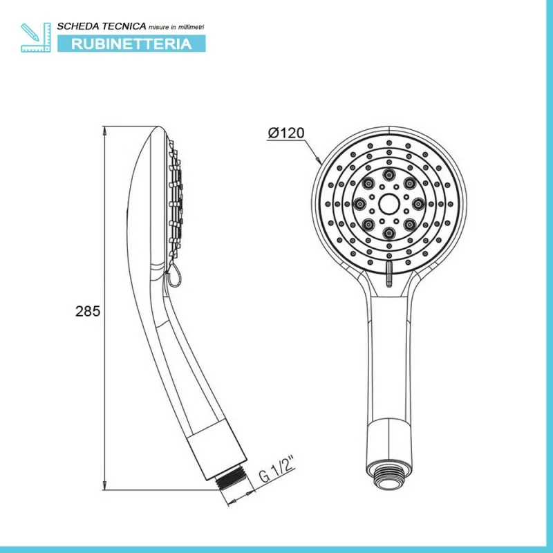 Questa doccetta è realizzata in ABS,materiale resistente,anticalcare con finitura cromata. Ha un''impugnatura leggermente incurvata. Il soffione tondo ha un diametro di 12 cm e la modalità multigetto ad 8 funzioni. La cornetta è consente un risarmio Idrico del 40 %.