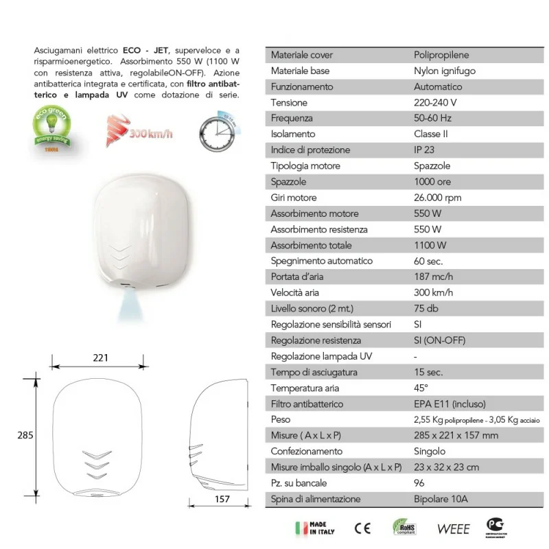 Caratteristiche tecniche asciugamani elettrico con fotocellula 1100W