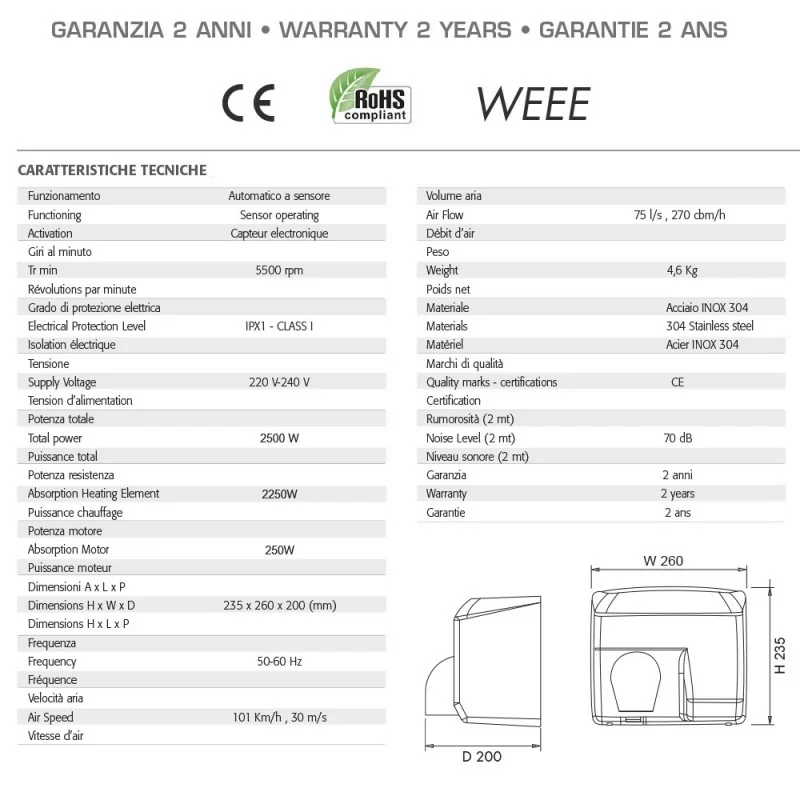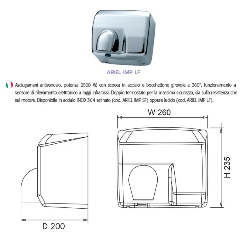 Caratteristiche tecniche asciugamani antivandalo elettrico acciaio inox lucido 2500W