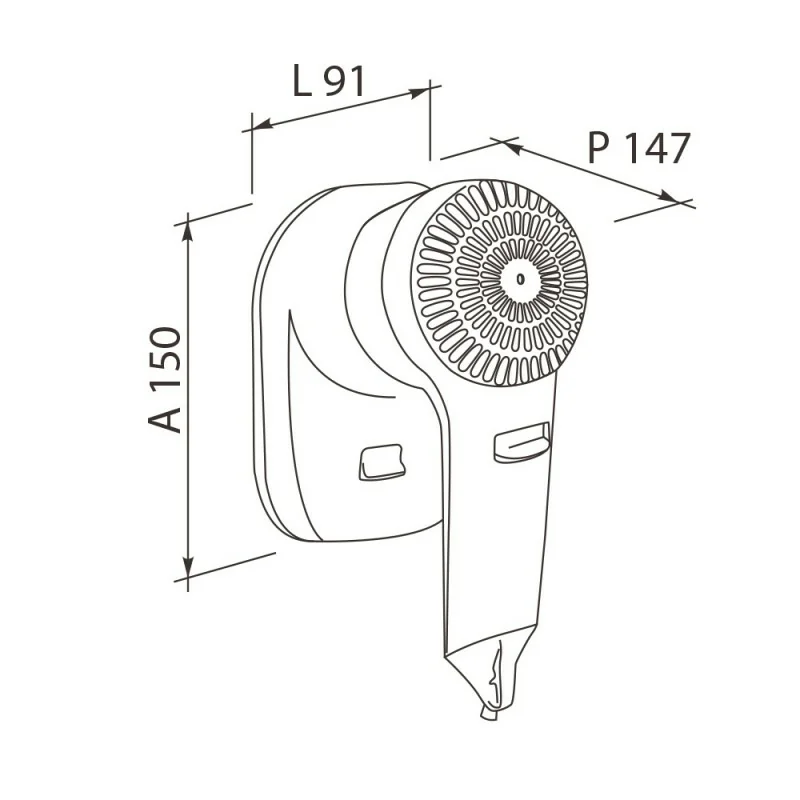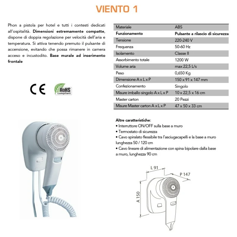 Phon per capelli si rivolge principalmente ad hotel e contesti dedicati all'ospitalità (B&B,residence,ecc.). Best seller di dimensioni estremamente compatte,dispone di doppia regolazione per velocità aria e temperatura. Grantisce un elevato risparmio energetico (con assorbimento massimo pari a 1200W). La base a muro in Abs per l'inserimento frontale è fornita nella confezione.