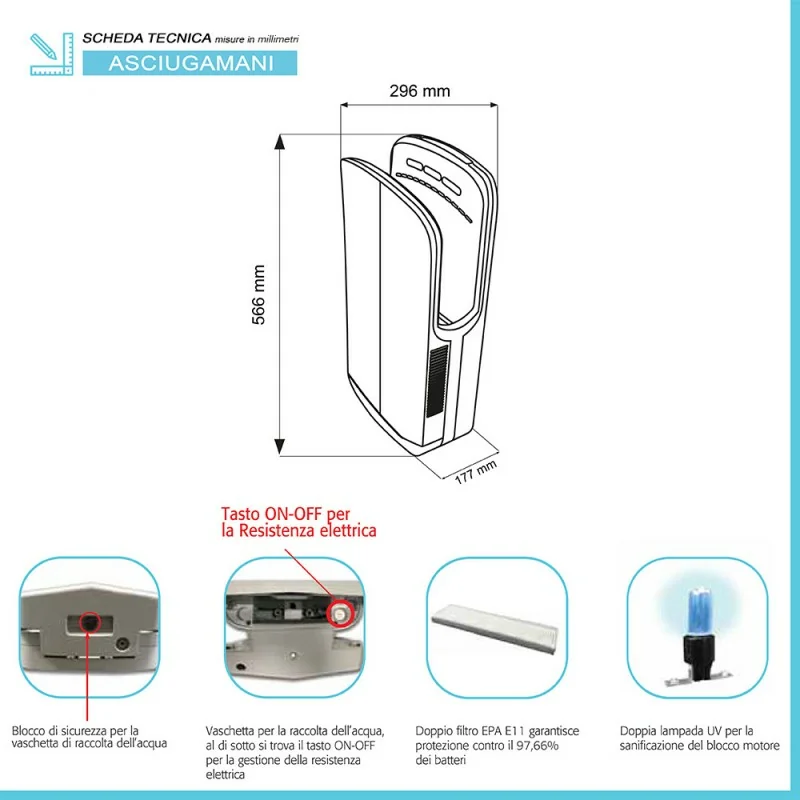 Asciugamani elettrico è il prodotto ideale,dallo stile accattivante e high tech, appositamente progettato per garantire la massima efficienza e il massimo rispetto dei requisiti di igiene, in tutti quei luoghi caratterizzati da grandi convergenze di persone. L'asciugamani dispensa un'esperienza piacevole, accompagnata da un'accurata pulizia ed asciugatura delle mani. L'asciugatore mani elettrico persegue tempi da record, offrendo un'asciugatura completa in soli 12/15 secondi. Merito di un flusso d'aria che circola alla sorprendente velocità di 410 km/h, che asciuga ed elimina la sensazione di umidità che spesso ha luogo. Questa super-velocità è affiancata da un massimo risparmio energetico, con un consumo energetico minimo ( parliamo di soli 1100W). La presenza dell'interruttore della resistenza ON-OFF,ottimizza i consumi durante i mesi primaverili-estivi e affina la comodità dell'asciugatura durante i mesi autunnali-invernali.