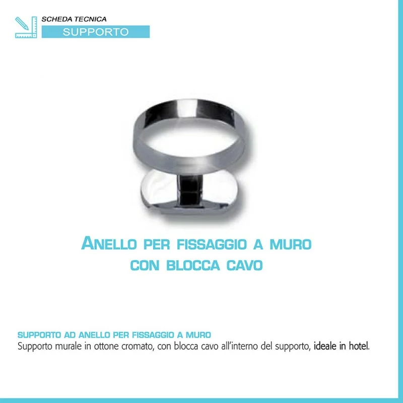Riepilogo caratteristiche tecniche supporto murale ad anello in ottone cromato per asciugacapelli hotel: