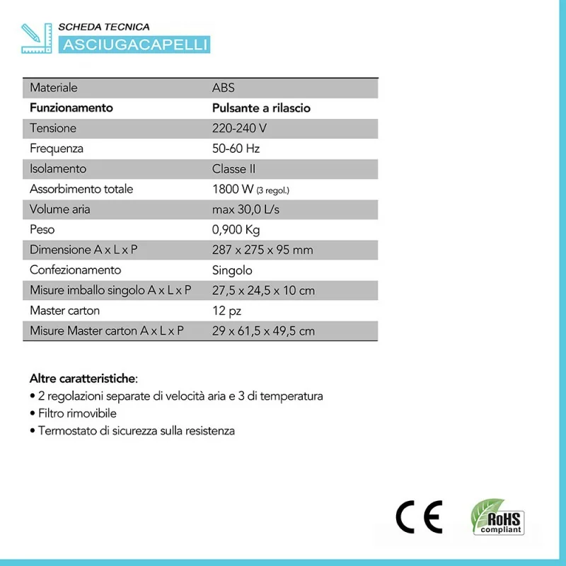 Riepilogo caratteristiche tecniche asciugacapelli phon a pistola 1800W uso hotel in ABS bianco