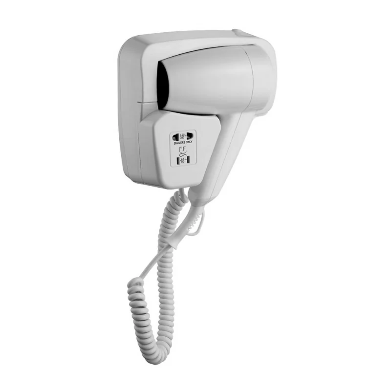 Asciugacapelli da cassetto o parete è il phon ideale per le strutture che offrono servizi di ospitalità (alberghi,bed and breakfast,residence,ecc.). Accompagnato da un design particolarmente compatto,è possibile utilizzarlo da cassetto o installarlo a muro. La base murale con inserimento dall'alto in ABS è solida e facilmente installabile. La presa universale per rasoio incorporata funzionante a  110-220 V è un accessorio altamente utile,che permette di alimentare e usare sotto ogni circostanza il proprio rasoio.