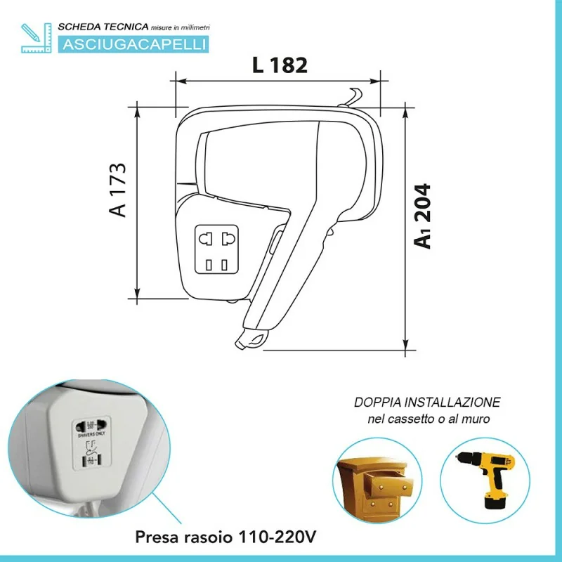 Asciugacapelli da cassetto o parete con presa universale per rasoio Dimensioni fono da cassetto o parete con presa universale per rasoio Scheda tecnica fon per capelli da cassetto o parete con presa universale per rasoio