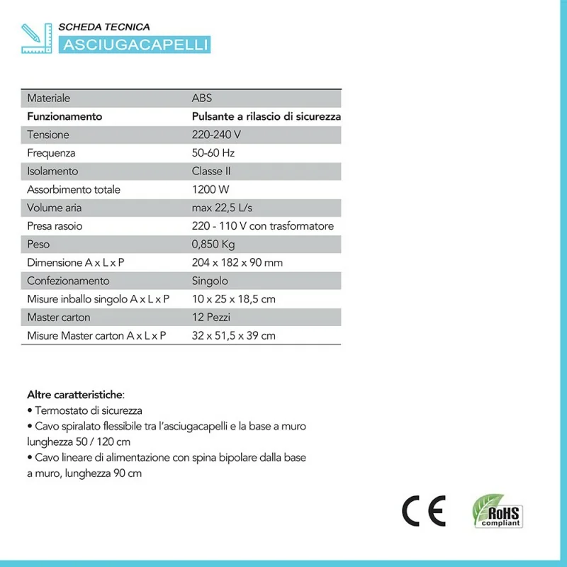 Riepilogo caratteristiche tecniche asciugacapelli da cassetto o parete 1200W con presa universale per rasoio