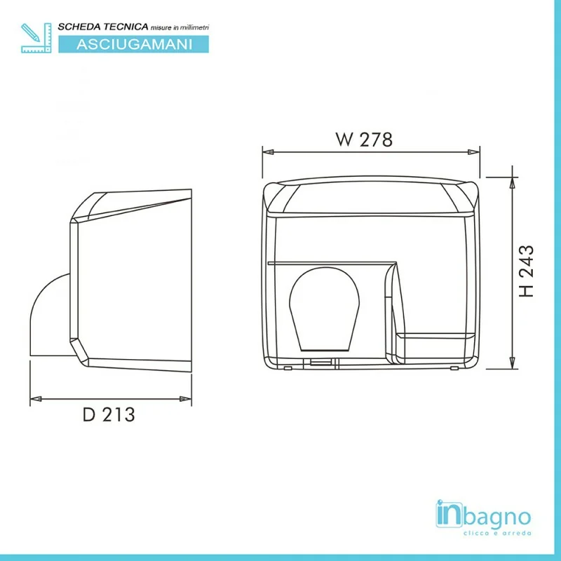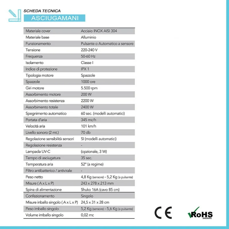 Riepilogo caratteristiche tecniche asciugamani elettrico automatico a sensore 2400W in acciaio bianco lucido