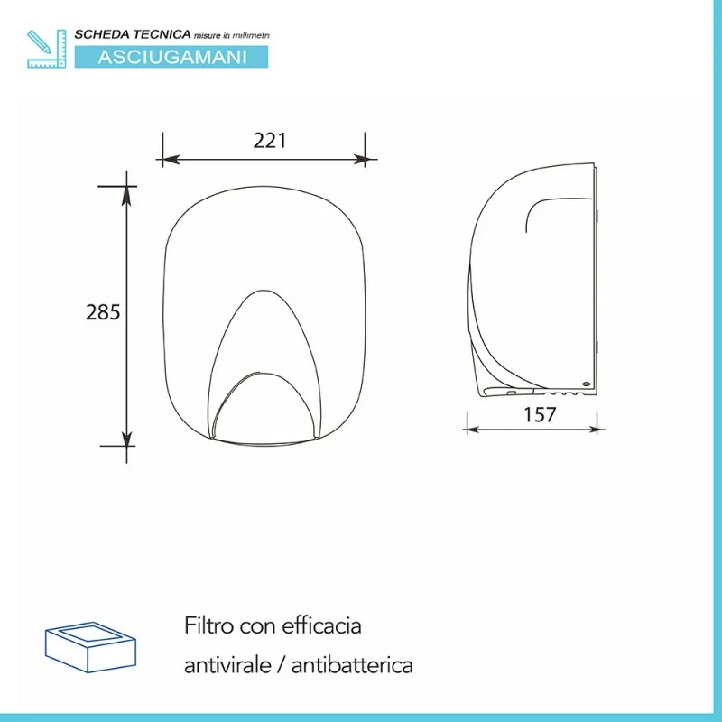 Asciugamani elettrico con sensore 1100W asciugatura con lama d'aria Dimensioni asciugatore mani elettrico a sensore 1100W asciugatura con lama d'aria Scheda tecnica asciugamano elettrico 1100W con sensore di rilevamento e asciugatura con lama d'aria Asciugamano elettrico 1100W con lama d'aria e sensore di rilevamento covid-free