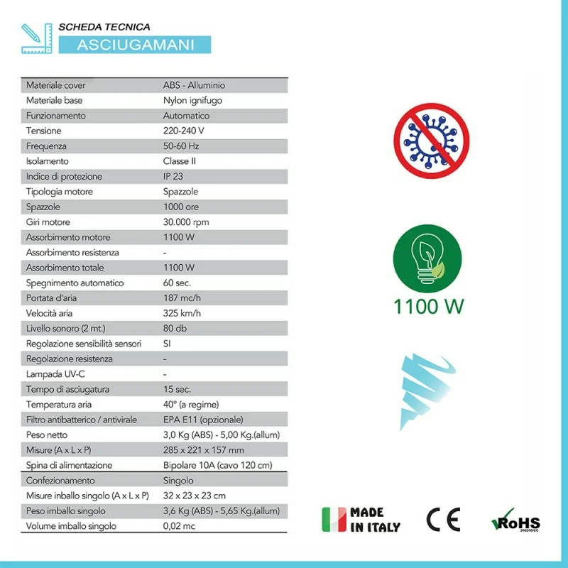 Riepilogo caratteristiche tecniche asciugamani elettrico con sensore di rilevamento 1100W e asciugatura con lama d'aria