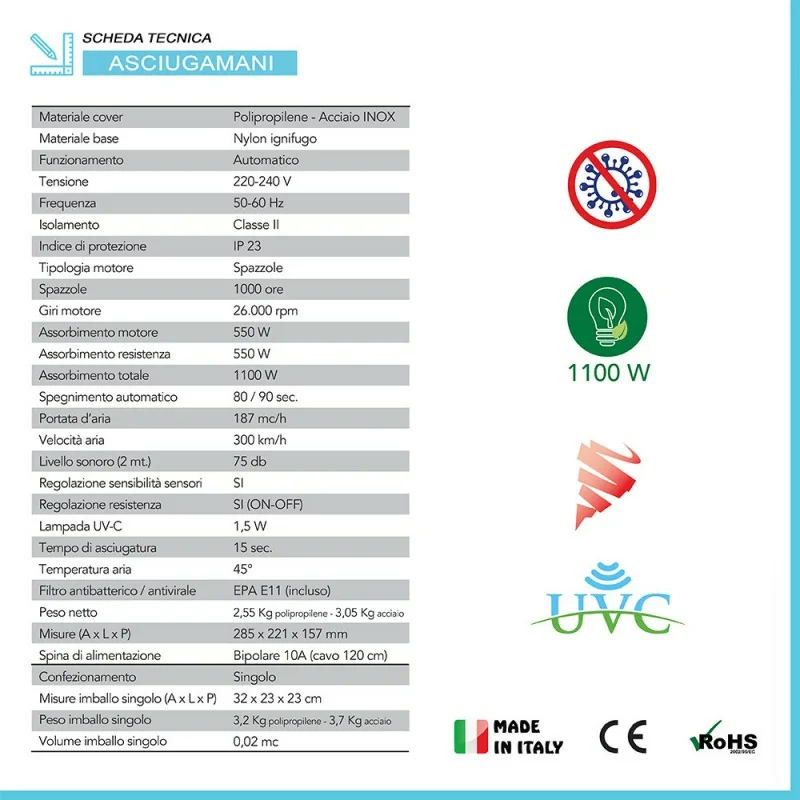 Riepilogo caratteristiche tecniche Asciugamani elettrico con sensore di rilevamento 1100W ultra veloce in acciaio inox lucido
