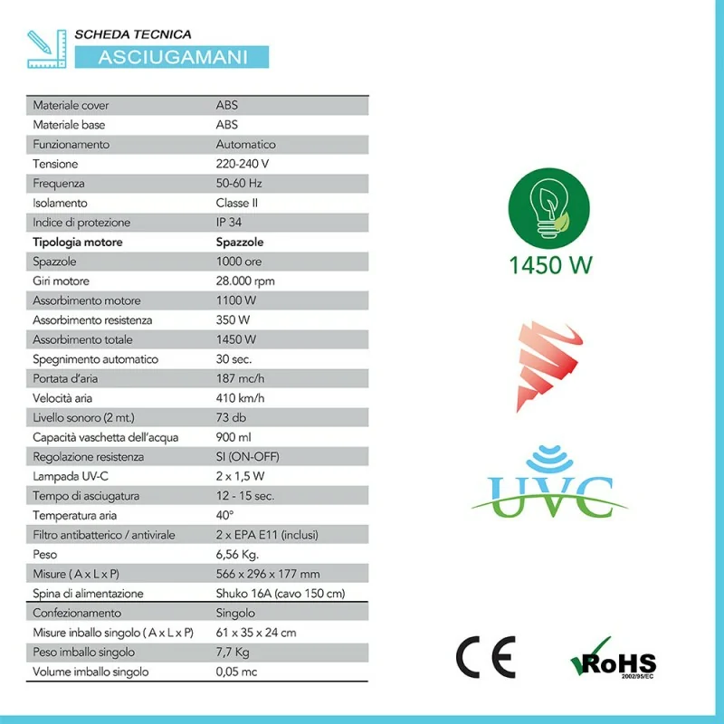 Riepilogo caratteristiche tecniche Asciugamani elettrico con fotocellula 1450W automatico e salvaspazio
