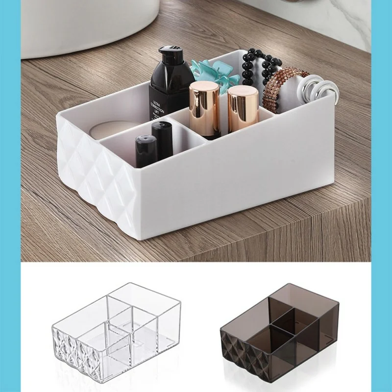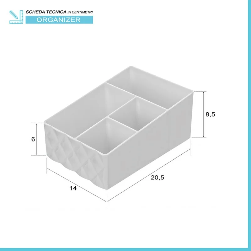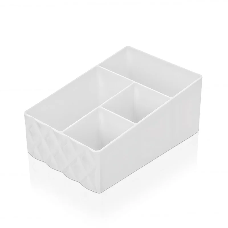 Organizer porta trucchi e cosmetici in plastica bianca con 4 scomparti Organizer porta cosmetici in plastica bianca con 4 scomparti Scheda tecnica organizer porta trucchi e cosmetici in plastica bianca con 4 scomparti Organizzatore cosmetici in plastica con 4 scomparti disponibile in 3 differenti colorazioni Porta trucchi bagno in plastica bianca con 4 scompartimenti