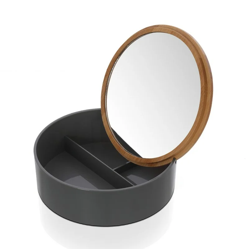 Porta trucchi da bagno tondo in plastica grigia e bamboo completo di specchio