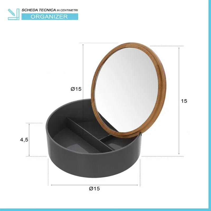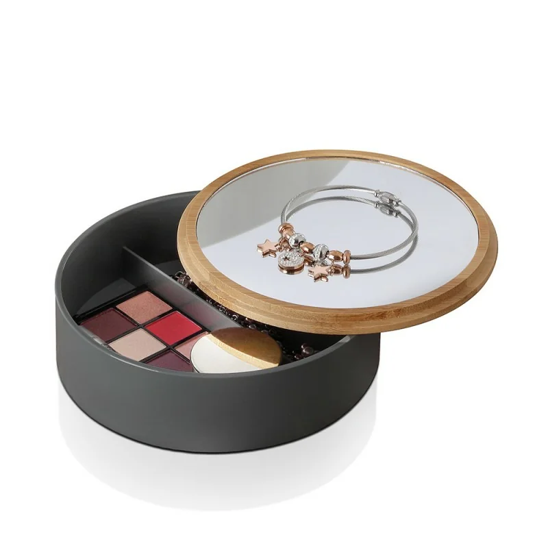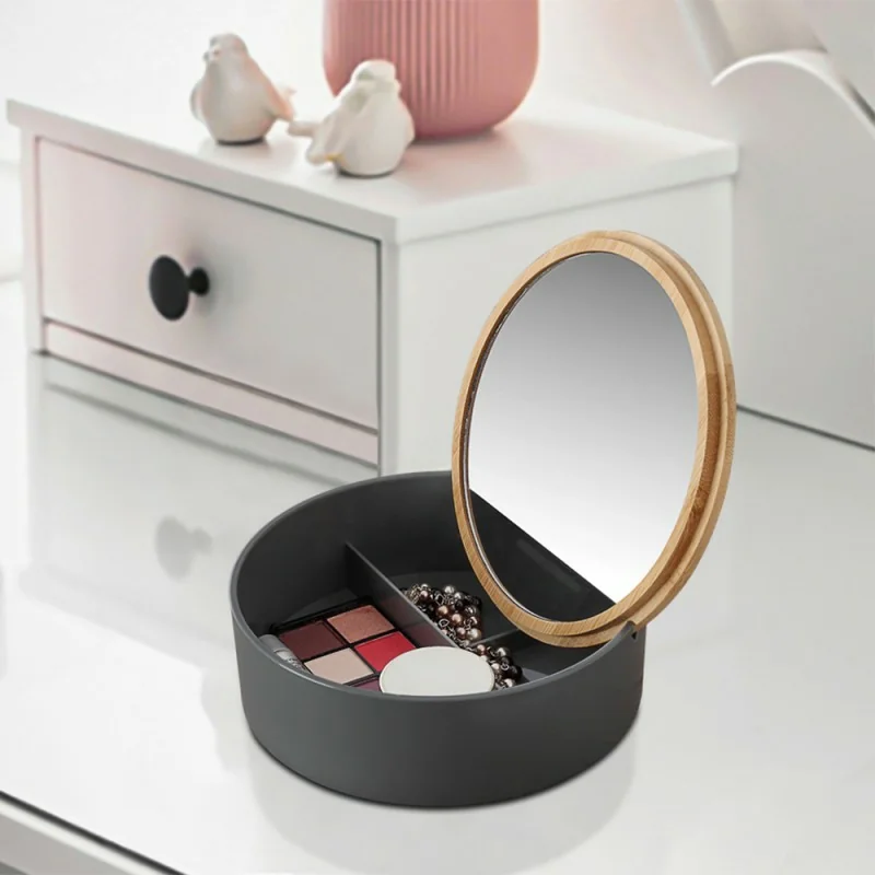 Organizer trucchi rotondo in plastica grigia completo di specchio con dettagli in legno di bambù