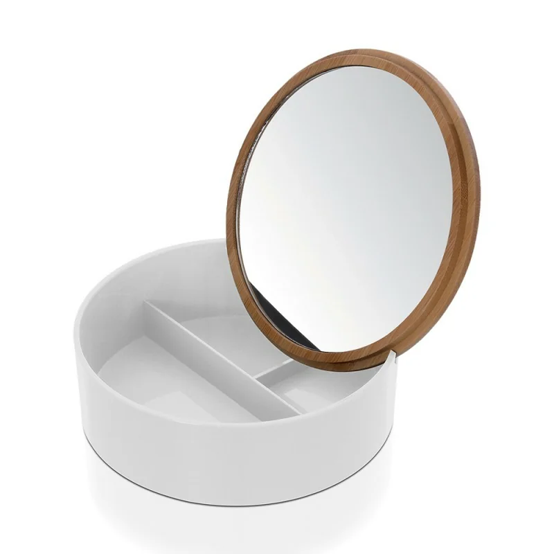 Porta trucchi da bagno tondo in plastica bianca e bamboo completo di specchio