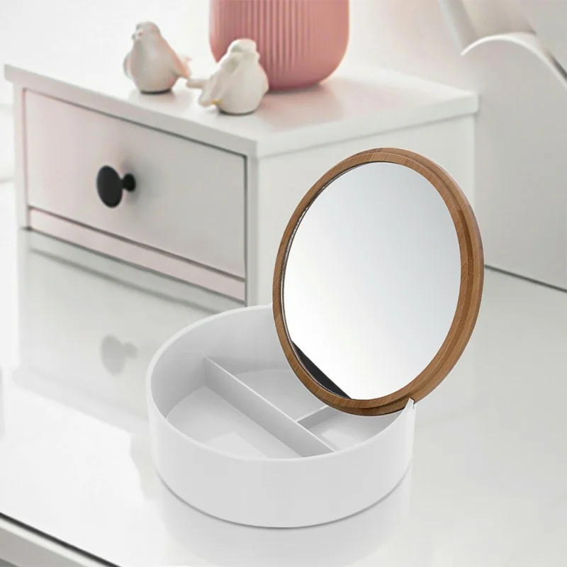 Organizer trucchi rotondo in plastica bianca completo di specchio con dettagli in legno di bambù
