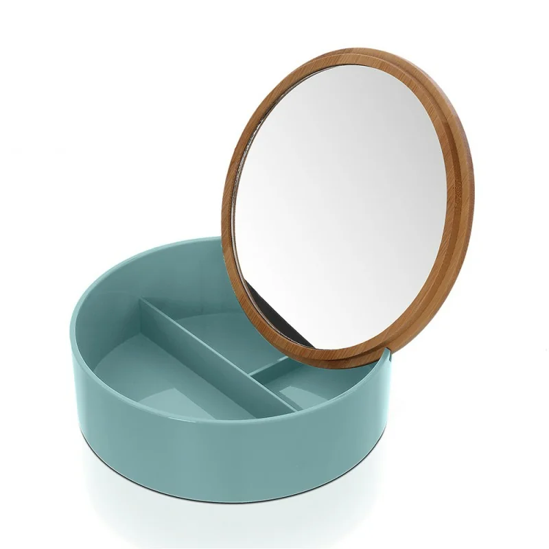 Organizer trucchi rotondo in plastica turchese completo di specchio con dettagli in legno di bambù
