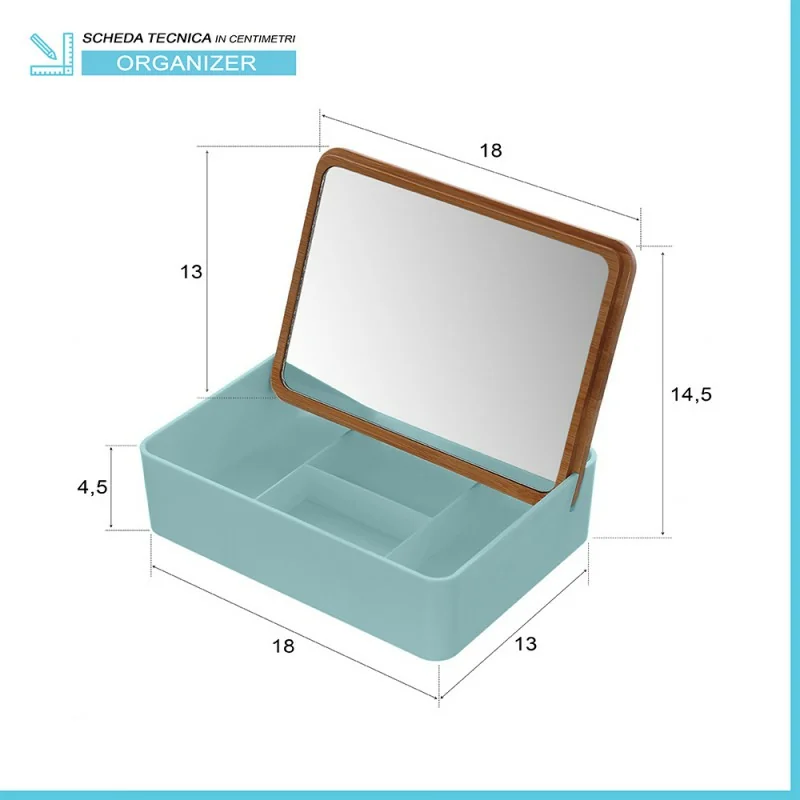 Organizer trucchi in plastica turchese completo di specchio con dettagli in bambù