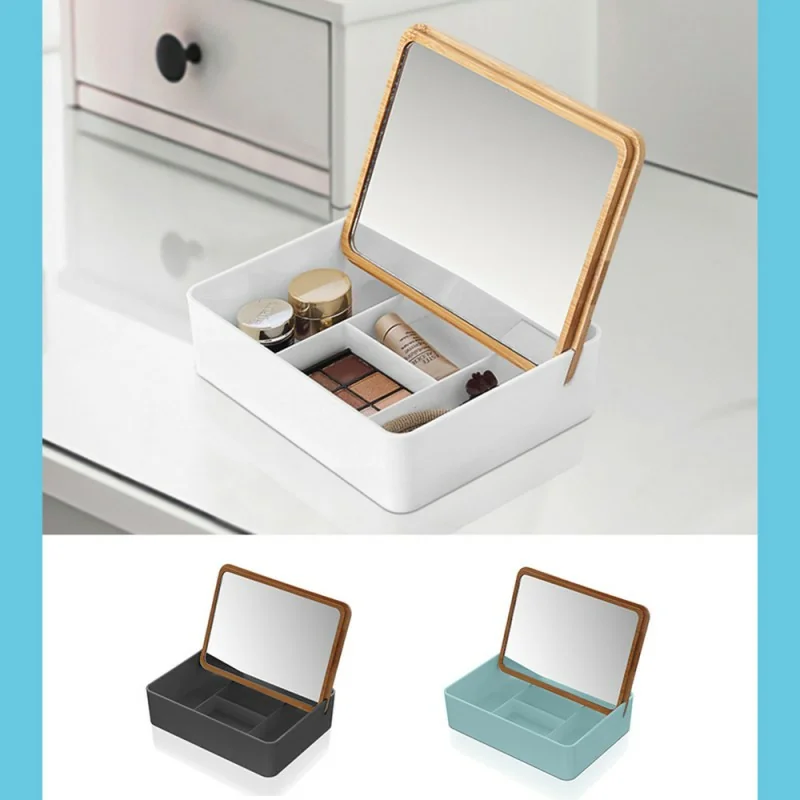 L'organizer cosmetici è costituito da un pratico coperchio in legno di bambù,che in posizione di riposo funge da elemento coprente e protettivo per i propri cosmetici,mentre quando si è in procinto di truccarsi basterà girarlo nel senso inverso e avrete a disposizione un comodo specchio con il quale aiutarvi durante la fase di make-up.