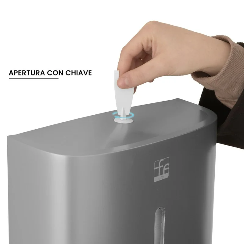 Erogatore di salviette contenente 200 fogli di carta piegata a Z,V,C con apertura mediante chiavetta