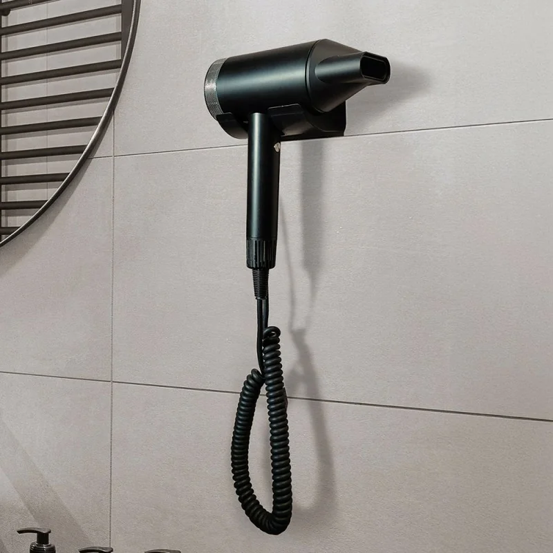 Asciugacapelli professionale da 1500W, ideale per alberghi, con motore brushless per prestazioni elevate e lunga durata. Colore nero. Include base murale per installazione fissa e un sistema di sicurezza con tasto a rilascio (spegnimento automatico) per prevenire surriscaldamenti.