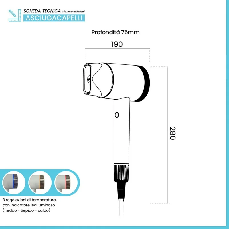 Ideale per l'utilizzo alberghiero e le strutture ricettive, questo asciugacapelli unisce l'alta tecnologia alla massima durabilità. Dotato di un innovativo motore brushless, garantisce prestazioni professionali, un'asciugatura rapida ed efficiente e una longevità superiore, resistendo all'uso intensivo tipico degli ambienti hotellerie. La finitura bianca, elegante e discreta, si integra con qualsiasi arredo bagno. Progettato specificamente per gli standard di sicurezza, include un pratico tasto a rilascio (push & release) che spegne automaticamente il dispositivo non appena l'impugnatura viene rilasciata o il phon riposto, prevenendo dimenticanze e surriscaldamenti.