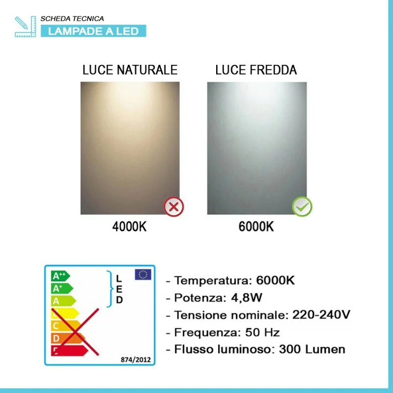 • Luce fredda con temperatura 6000 K e potenza 4,8 W;
