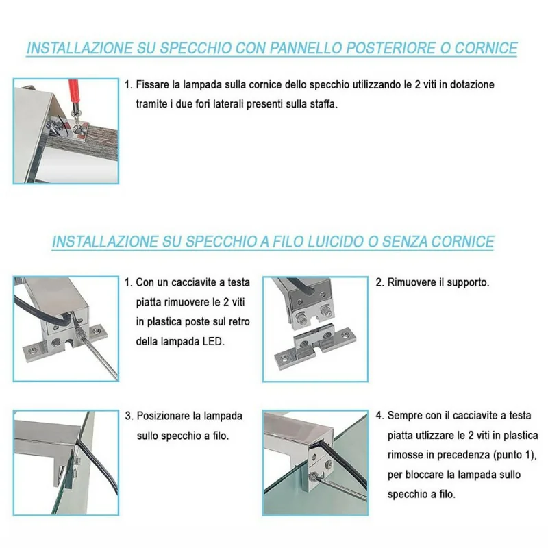 Concepita per dare carattere e rendere più luminoso qualsiasi arredo bagno,l’applique LED è un modello universale di lampada dotato di doppia modalità di installazione:può essere posizionata sia su specchiere con cornice o pannello posteriore che su specchi lisci a filo lucido.