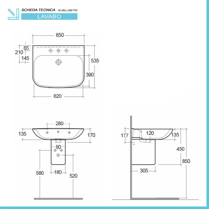 • Tipologia:lavandino bagno sospeso con semicolonna;