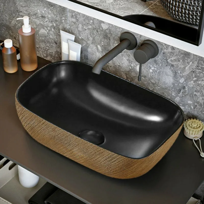 Lavabo da appoggio 45x32 cm in ceramica nera opaca con decorazione oro