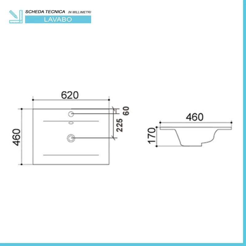 Il lavabo ha pratica forma rettangolare,è realizzato in ceramica di alta qualità con finitura bianco lucido ed è già forato per troppo pieno e per ospitare una rubinetteria monoforo,ideale per evitare di forare appositamente la ceramica.