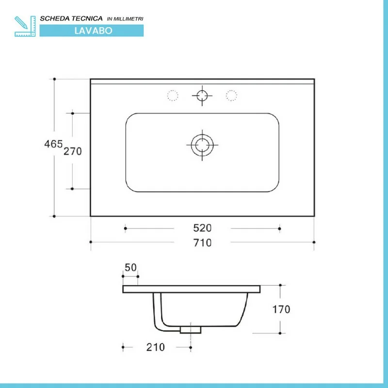 È realizzato in ceramica di alta qualità,materiale che permette una pulizia facile e veloce,sia con l’utilizzo dell’acqua sia con prodotti detergenti. Il lavabo dispone di foro per la rubinetteria e troppo pieno,viene installato ad incasso su mobile o base porta lavabo. E' disponibile nelle misure 60,70,80,90 e 100 cm.