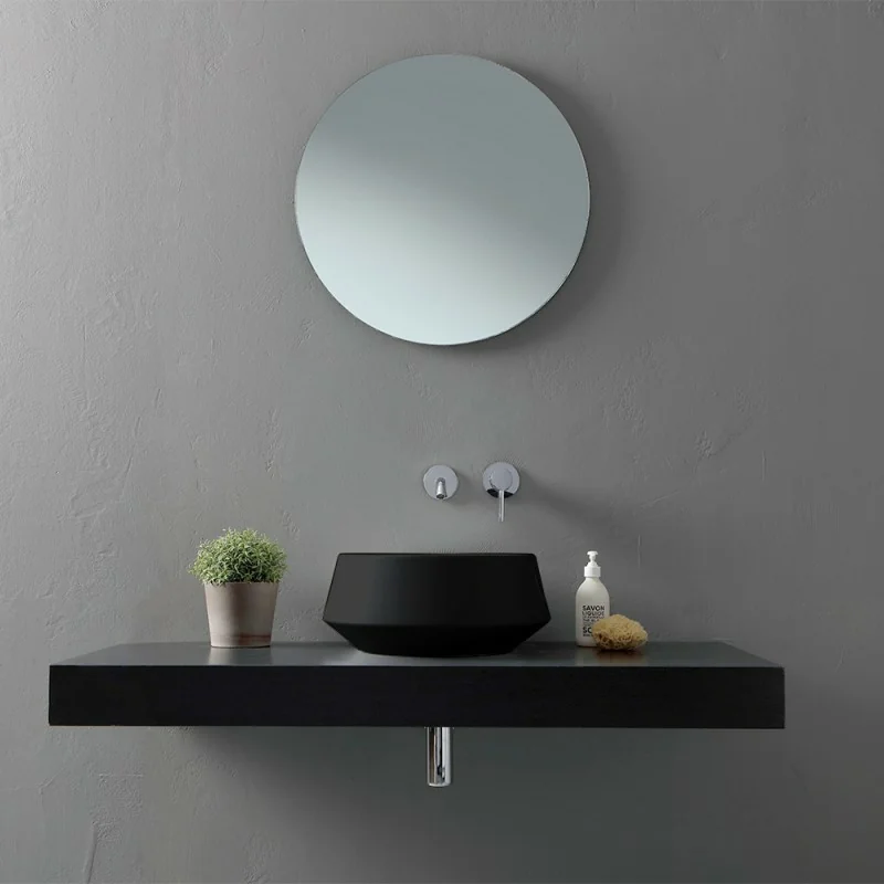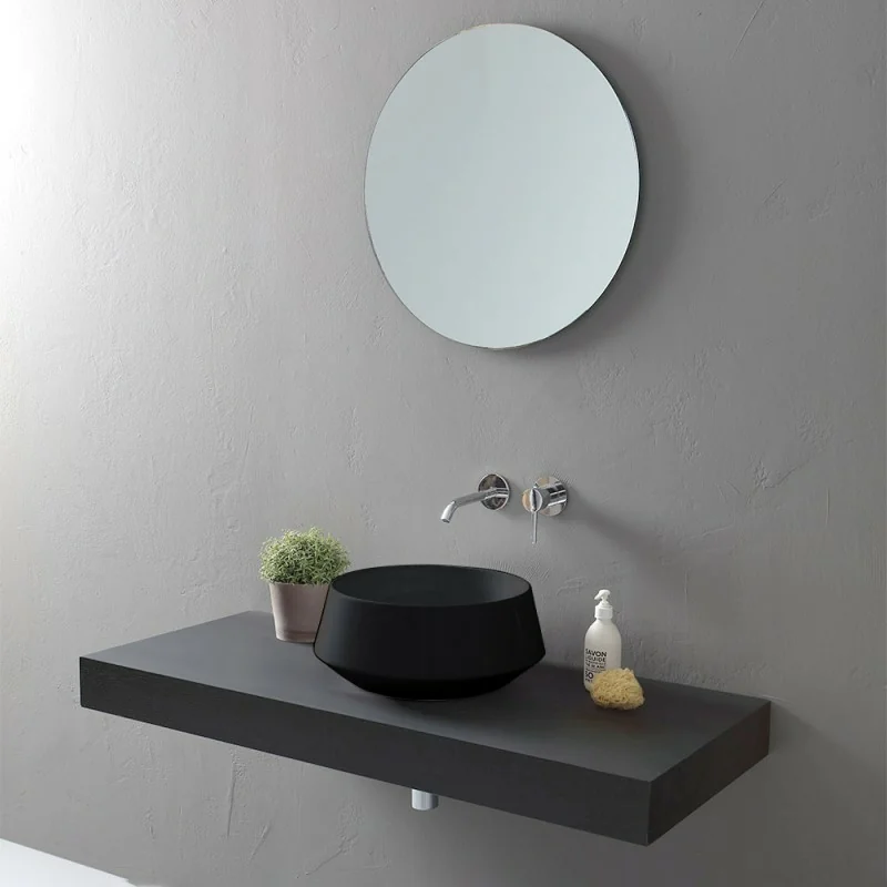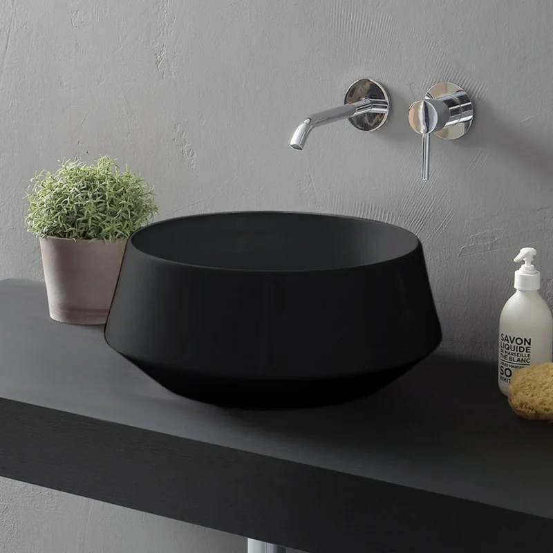 Il lavabo proposto è realizzato in ceramica,materiale più utilizzato nella produzione di sanitari,particolarmente solido e resistente ai segni d’usura. È con finitura nero opaco e la sua ampia capienza è data da una forma tonda con diametro 42 cm.