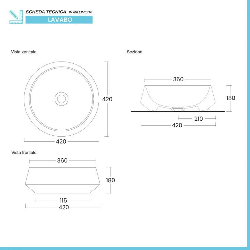 Lavabo bagno con forma tonda da installare in appoggio su mensola,top o mobile bagno