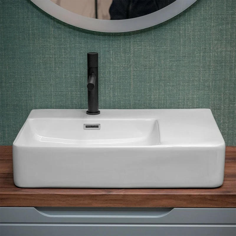Integralmente realizzato in ceramica con finitura lucida,materiale moderno,performante e facile da pulire,il lavabo è progettato per essere installato in appoggio su mensole o mobili bagno con top. Dispone di foro troppo pieno e foro per miscelatore.